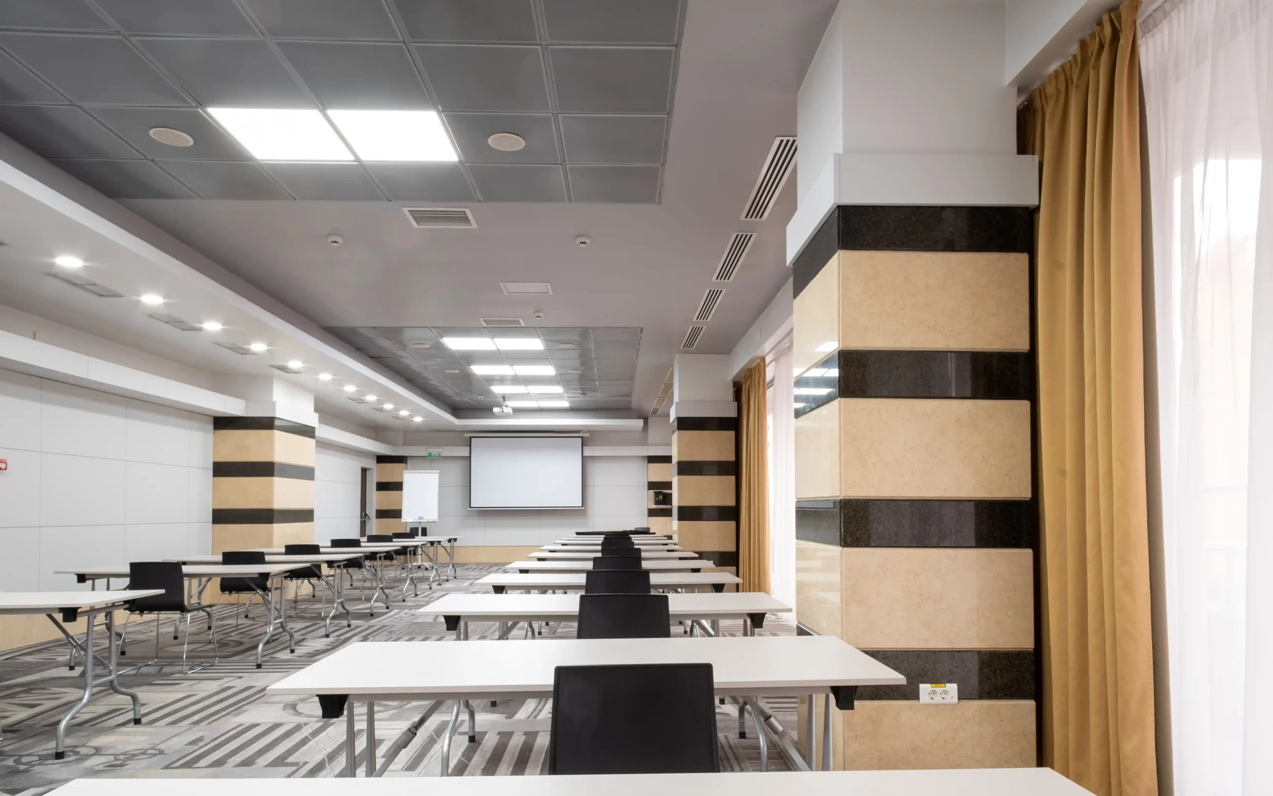 The conference rooms at Hotel Mercure offer a functional setting for business meetings, workshops, and corporate events. The spaces are designed with a neutral color palette, dominated by shades of gray, white, and beige, which creates a subdued and professional atmosphere. The rooms are furnished with simple tables and chairs, arranged in a way that allows flexibility depending on the event’s requirements.
